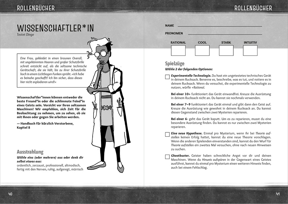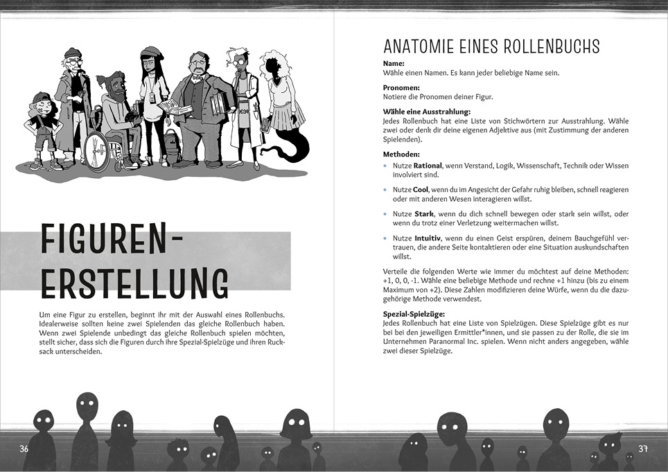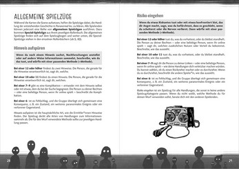 Nach der Erstellung eurer Figuren (basierend auf sieben verschiedenen Rollenbüchern) macht ihr euch direkt an die Ermittlung. Dafür nutzt ihr eins der im Spiel enthaltenen Mysterien (oder erstellt selbst eines). Die Mysterien versorgen euch jeweils mit einer Ausgangssituation, 10 Schauplätzen, 30 paranormalen Ereignissen, 10 Nebenfiguren und 30 Hinweisen, die ihr im Laufe des Spiels mit Hilfe eines Spielkartendecks (z.B. Poker) zufällig zieht und in die Erzählung einbringt. Ansonsten gestaltet ihr die Szenen frei und nutzt dabei eure Spielzüge und würfelt (meist 2W6). Entsprechend des Würfelergebnisses erzählt ihr Erfolge, Misserfolge und Komplikationen.