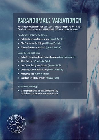 Zusätzlich zum Grundregelwerk von Paranormal Inc. (das Erzählrollenspiel von Alicia Furness) gibt es hier neun zusätzliche Mysterien von acht deutschsprachigen Autor*innen. Diese Mysterien wurden als Bonusziel im Crowdfunding finanziert.